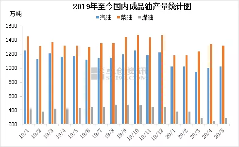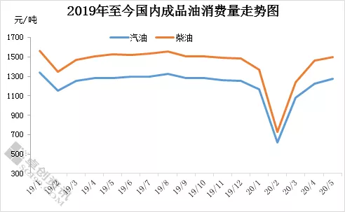 由上图可以看出,2020年上半年,中国成品油消费量呈现“V”型走势。卓创资讯数据统计显示,2020年一季度中国汽油消费总量为2860.89万吨,同比下降23.53%,柴油消费量为3336.96万吨,同比下跌23.80%。5月份,中国汽油消费量1278万吨;柴油消费量1500万吨,基本恢复至去年同期水平。汽油方面,随着公共卫生事件对国内影响减弱,五一驾车出行人数增加,终端加油站用户库存稳步消化,节后市场出现一小波补库操作,汽油出货表现较好。柴油方面,由于南方进入雨季,且沿海休渔期正式开始,高速恢复收费等消息对柴油需求形成一定抑制,不过北方地区麦收开始,对柴油需求亦型形成一定支撑。总体来看,汽柴油的消费增速有放缓,但仍保持涨势。