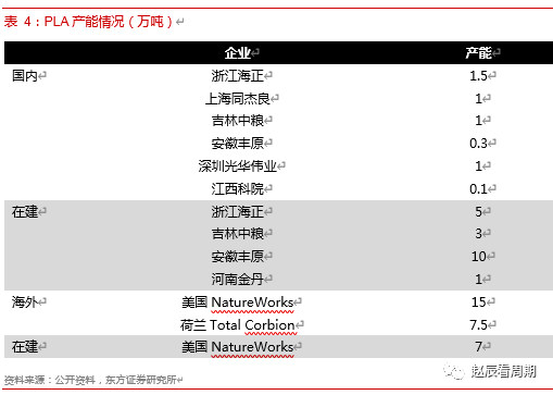 PLA的生产技术具有较高壁垒,主要分为乳酸-丙交酯-聚乳酸的两步法和乳酸直接制聚乳酸的一步法,目前除了上海同杰良以外其他企业基本都采用两步法路线。海外企业主要有美国Nature Work、荷兰Total Carbin与日本武藏野三家公司生产聚乳酸,其中规模最大的是Nature Work,拥有15万吨产能,已经运行近20年,近期计划在泰国新建7万吨产能。国内产业发展速度也不慢,06年就由浙江海正实现了5000吨/年的聚乳酸工业化生产。国内聚乳酸技术主要依靠的是科研机构与企业合作的自主开发,目前已经投产的浙江海正与上海同杰良的技术分别来自长春应化所与同济大学,金丹科技在建的项目(生产核心中间体丙交酯)技术来自南京大学。
