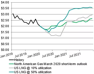 (1)如果美国LNG产能利用率仅有10%,2020下半年开始到2020年冬季前HH气价将低至约1.25美元/MMBtu,2021年将达到2.62美元/MMBtu。(2)如果美国LNG产能利用率达到50%,HH气价将从2020年2.01美元/MMBtu增至2021年的3.45美元 /MMBtu(图4)。(3)无论是10%还是50%产能利用率,HH气价预计都将在2020年冬季回升,2021年趋于正常。
