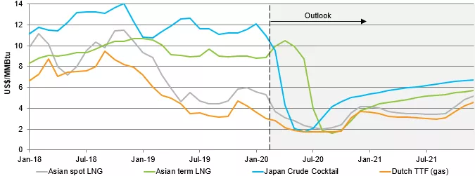 预计2020年油价大跌将使亚洲非现货LNG与现货LNG长期存在的价差基本消除(图5)。从图中可看出,从2019年初到2020年1月,全球LNG市场供大于求,导致LNG现货价格不断走低,比非现货价格低得多,2019年四季度均价价差达3.5美元/MMBtu。但是,油价大跌直接导致JCC油价下调,使亚洲LNG非现货价格下跌至十年来的新低,甚至跌至低于现货价格,这样,LNG非现货和现货之间的价差就基本消除。预计今年第四季度LNG非现货价格可能比现货要低0.5美元/ MMBtu。2021年初开始,LNG非现货和现货之间的价差将再次出现;但到2021年冬季,对现货LNG需求增高,价差将再次缩小。