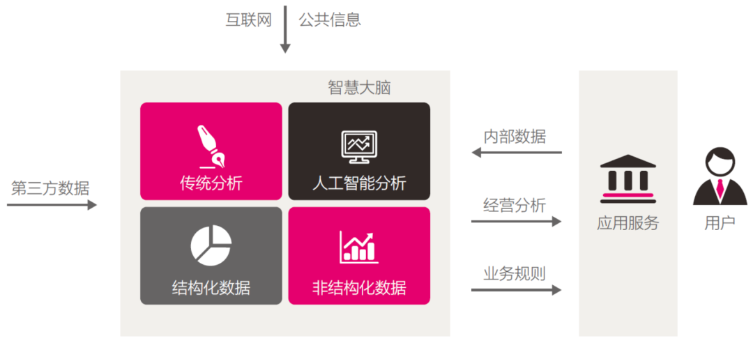 分析能力:传统企业以面向运营为主(事后分析),利用线性算法,分析少量数据。智慧大脑采用分析加预测的架构,通过智能算法,处理海量数据。