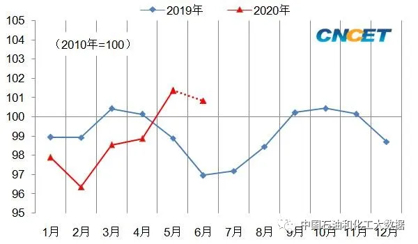2020年5月化工行业综合景气指数终值为101.4,预计2020年6月景气指数初值为100.9,行业景气度将略有下降。