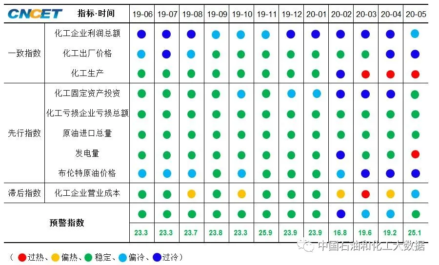 5月份,中国化工行业预警指数为25.1,指数值较4月份大幅增长,亦从浅蓝灯区恢复至绿灯区运行。