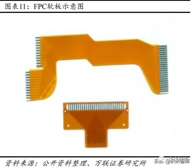 覆铜板(CCL)是PCB的基板,由铜箔、玻璃纤维布、树脂以及其他填充材料构成。根据CCL使用的树脂材料不同,可将印刷电路板划分为硬板和软板两类。其中,硬板 通常用PCB指代,也称作“刚性线路板”,4G时代一般使用FR-4(环氧树脂玻璃布基) 作为基材,其机械强度较高,不能弯折、绕曲,因此通常应用于消费电子产品主板以 及基站等通信设备;印刷电路板软板简称为FPC软板,全称为“柔性电路板”,通常 以柔性材料PI(Polyimide,聚酰亚胺)作为基材,因此可进行弯折、绕曲,通常用于 需要重复绕曲或结构复杂的小零部件的连接。