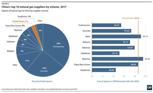 事实上,中国天然气进口资源主要有管道气和液化天然气(LNG)2种,其中管道气主要由中亚和缅甸等国供应,而LNG则由澳大利亚、卡塔尔、马来西亚、印尼和美国等提供。而自从出现页岩气革命以来,美国天然气产量出现"爆炸式增长",2011年已经超越俄罗斯成为全球最大产气国,未来该国还有望成为全球最大天然气出口国。