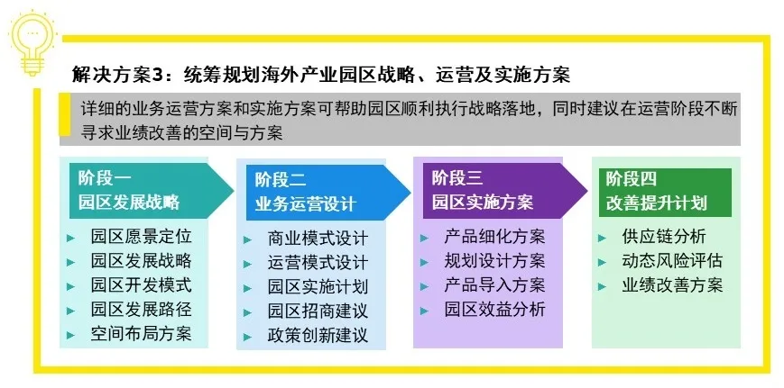 安永建议,相关企业可统筹规划海外产业园区战略、运营及实施方案,通过竞合分析帮助投资者了解竞争格局,制定合理可行的发展战略;而详细的业务运营方案和实施方案则可帮助园区顺利执行战略落地,同时建议在运营阶段不断寻求业绩改善的空间与方案。