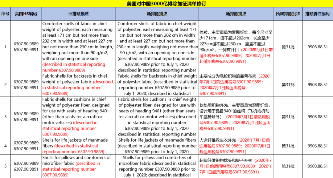本次公告还对此前编码为6307.90.9889的5项排除产品描述进行了修订,出口企业需重新审查是否符合排除条件。