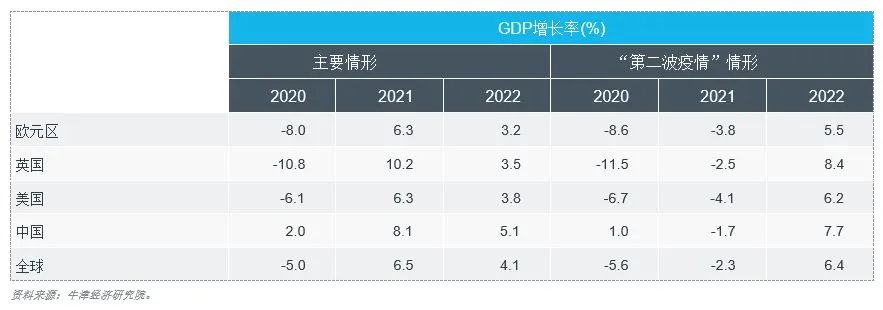 美国部分地区也出现了疫情反复的情况。这种疫情反复的情况几乎是不可预测的,任何地方都有可能发生。出现这种情形时,相关国家可能不得不在局部或者全国范围内再次采取封锁措施,如此势必会再次对经济活动造成负面影响。如下表所示,2021年的增长率可能也会因此变为负数,该表列出了主要情形和“第二波疫情”情形下的预测。