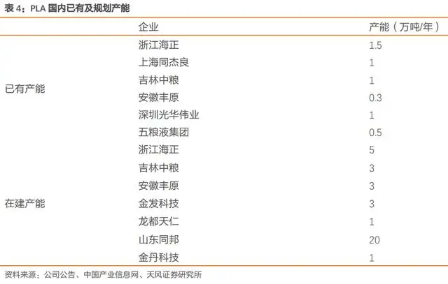 国内 PLA 2018 年进口量为 1.59 万吨,国产化率约 35%。海正、丰源 等公司初步具备 PLA 量产技术,金丹科技 1 万吨、金发科技 3 万吨 PLA 产能规划在建中。