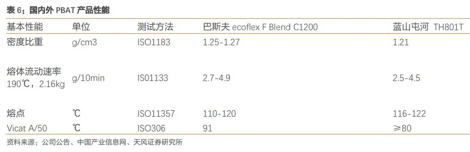 中国为全球最大的 PBAT 生产国家,产能占全球比例达 57%,生产 PBAT 产品性能与海外龙头公司巴斯夫产品性能相似。金发科技 为国内 PBAT 行业龙头,瑞丰高材、彤程新材 6 万吨产能规划在建中。