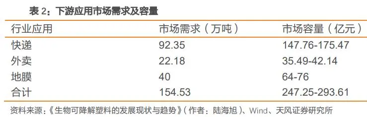 我国可降解塑料市场渗透仅 0.04%。据测算,政策落地后,仅外卖、快递、农膜三个领域,未来可降解塑料需求将达到 154.53 万吨,对应可降解塑料市场约 270 亿元。对比我国当下 4.2 万吨的市场需求量,市场增长空间达 36 倍。