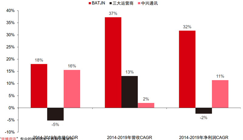 4G时代,移动互联网蓬勃发展。据爱立信和中国工信部统计,2019年全球和中国移动互联网月度接入流量分别为38EB和0.5EB,对应2014-2019年CAGR分别为64%和116%。同期,中国互联网巨头BATJN的加总市值、营收、净利润CAGR分别为18%、37%和32%,显著优于运营商及设备商的表现。互联网应用端的投资机会,主要受益于流量资费的下降:流量成本由2014年的138元/GB显著下降至2019年的6元/GB,累计降幅超过95%。