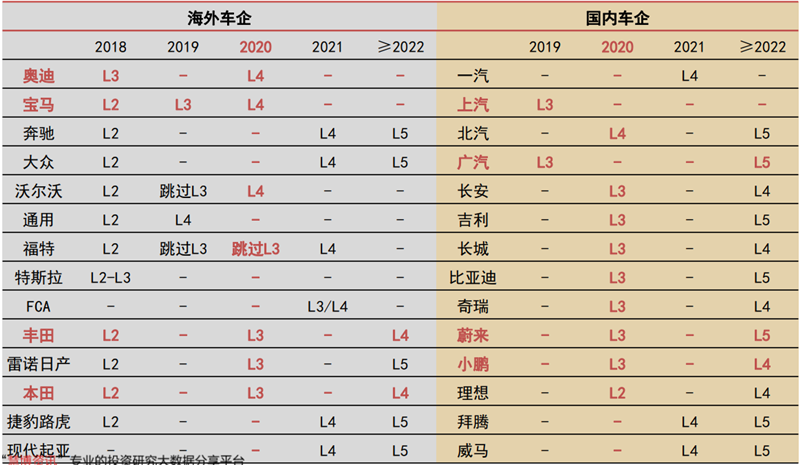 ▲国内外主流车企计划于2020-2021年推出L3/L4自动驾驶量产车型