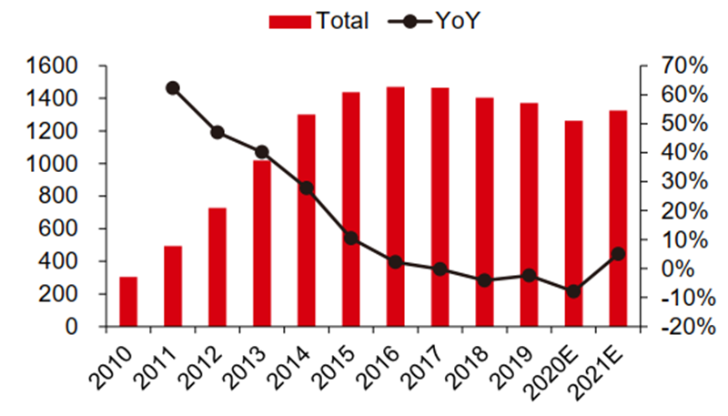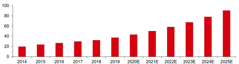 ▲ 2014-2025年全球智能终端产品出货量(亿台):未来6年CAGR为15.81%