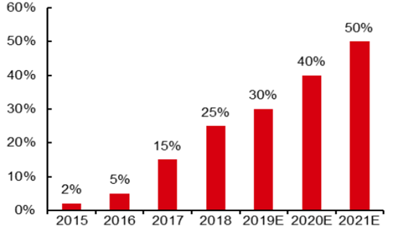 ▲全球部分主要地区数据中心云业务需求占比(2018)