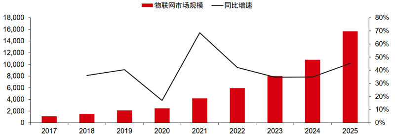 据Statista数据统计,2017年和2020年全球物联网市场规模分别为1110亿美元和2480亿美元,预计到2025年市场规模将会达到15670亿美元,CAGR高达39%。据IDC调查报告显示,中国物联网市场规模增长潜力广阔,2022年将超越美国成为最大的物联网市场,占全球总规模的四分之一以上,以此计算的2025年中国物联网市场规模至少为3918亿美元。