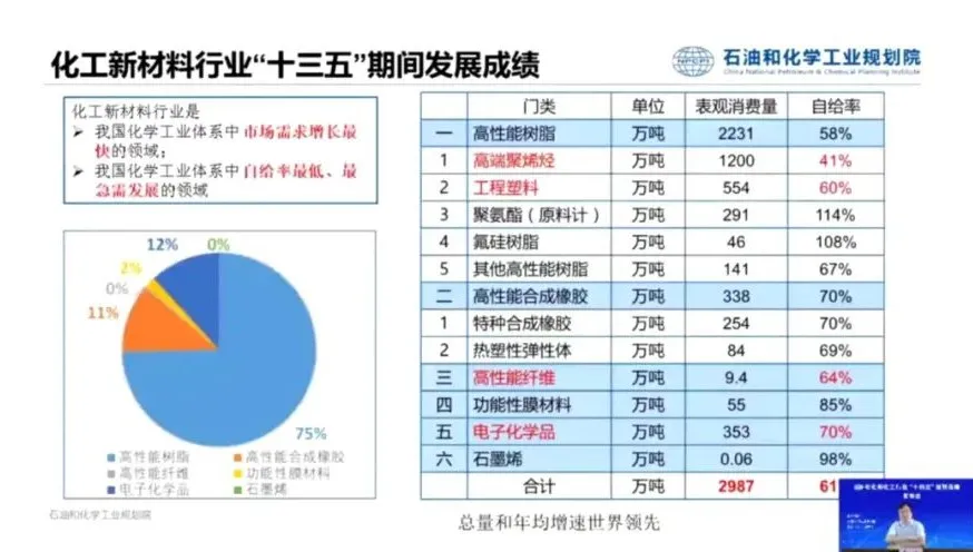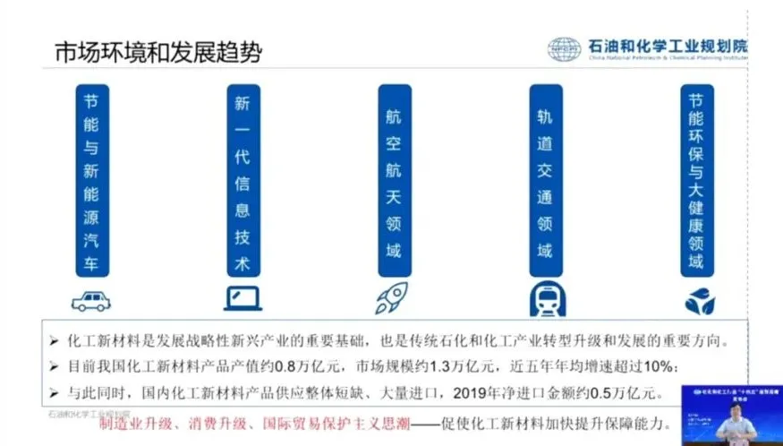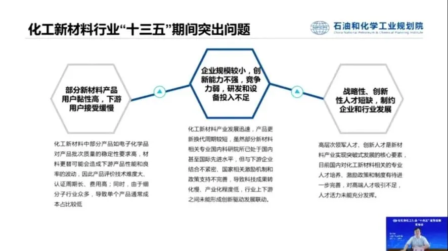 化工新材料是指通过化学合成的手段生产的新材料,以及部分以化学合成的化工新材料为基础通过二次加工生产的复合材料。作为我国《国家中长期科学和技术发展规划纲要(2006━2020年)》中重点关注的基础原材料,化工新材料目前正受到越来越多的重视。在昨日召开的“石化和化工行业‘十四五’规划指南发布会”上,石油和化学工业规划院李岩详细介绍了我国化工新材料行业”十三五“期间突出存在的问题,以及化工新材料行业”十四五“发展重点和实施路径等。