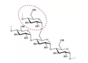 图4是溶剂2索提残留物或者溶解离心沉淀物的红外光谱图3423 cm-1的峰强且宽,主要来自羟基OH伸缩振动。2929 cm-1来自C-H伸缩振动,1020 cm-1,1080 cm-1,1156 cm-1的强峰来自C-O伸缩振动,761 cm-1来自O-H面外弯曲振动。下图是淀粉的结构式。