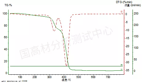 图6是样品在氮气氛围中的TGA图,TGA主要分为3段,第一段是增塑剂甘油的失重,比例为5%,第二段22%的失重来自淀粉,第三段的失重主要来自PBAT,马弗炉煅烧的灰分含量为0.4%。