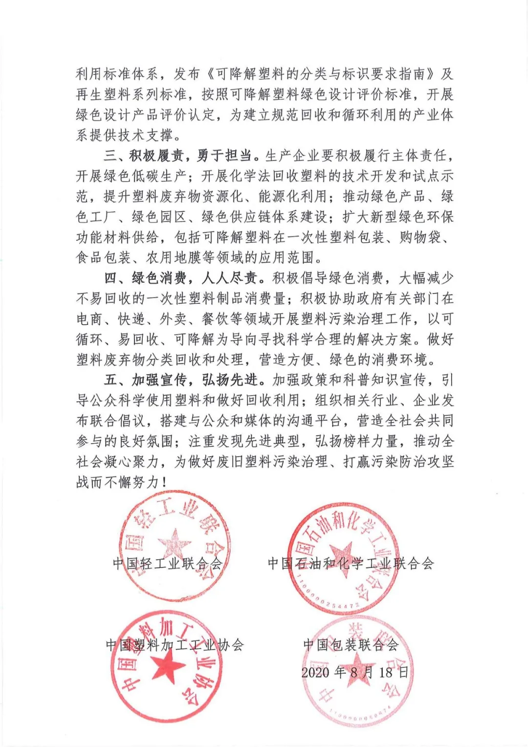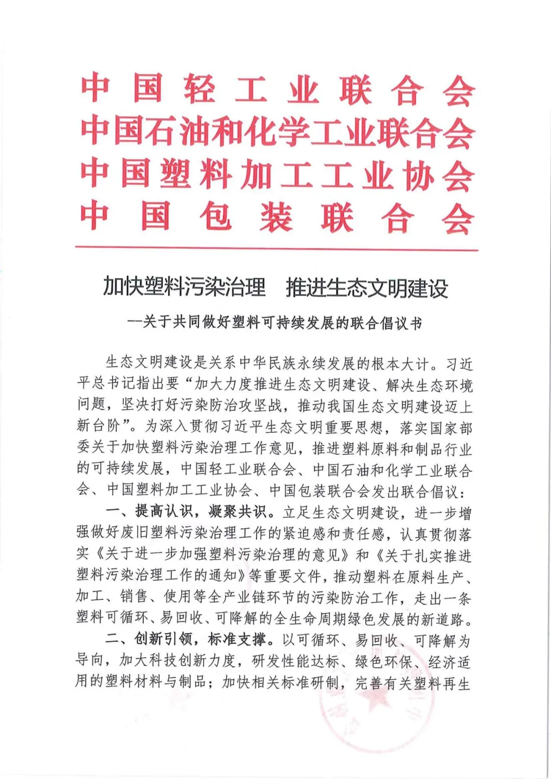 生态文明建设是关系中华民族永续发展的根本大计。习近平总书记指出要“加大力度推进生态文明建设、解决生态环境问题,坚决打好污染防治攻坚战,推动我国生态文明建设迈上新台阶"。为深入贯彻习近平生态文明重要思想,落实国家部委关于加快塑料污染治理工作意见,推进塑料原料和制品行业的可持续发展,中国轻工业联合会、中国石油和化学工业联合会、中国塑料加工工业协会、中国包装联合会发出联合倡议: