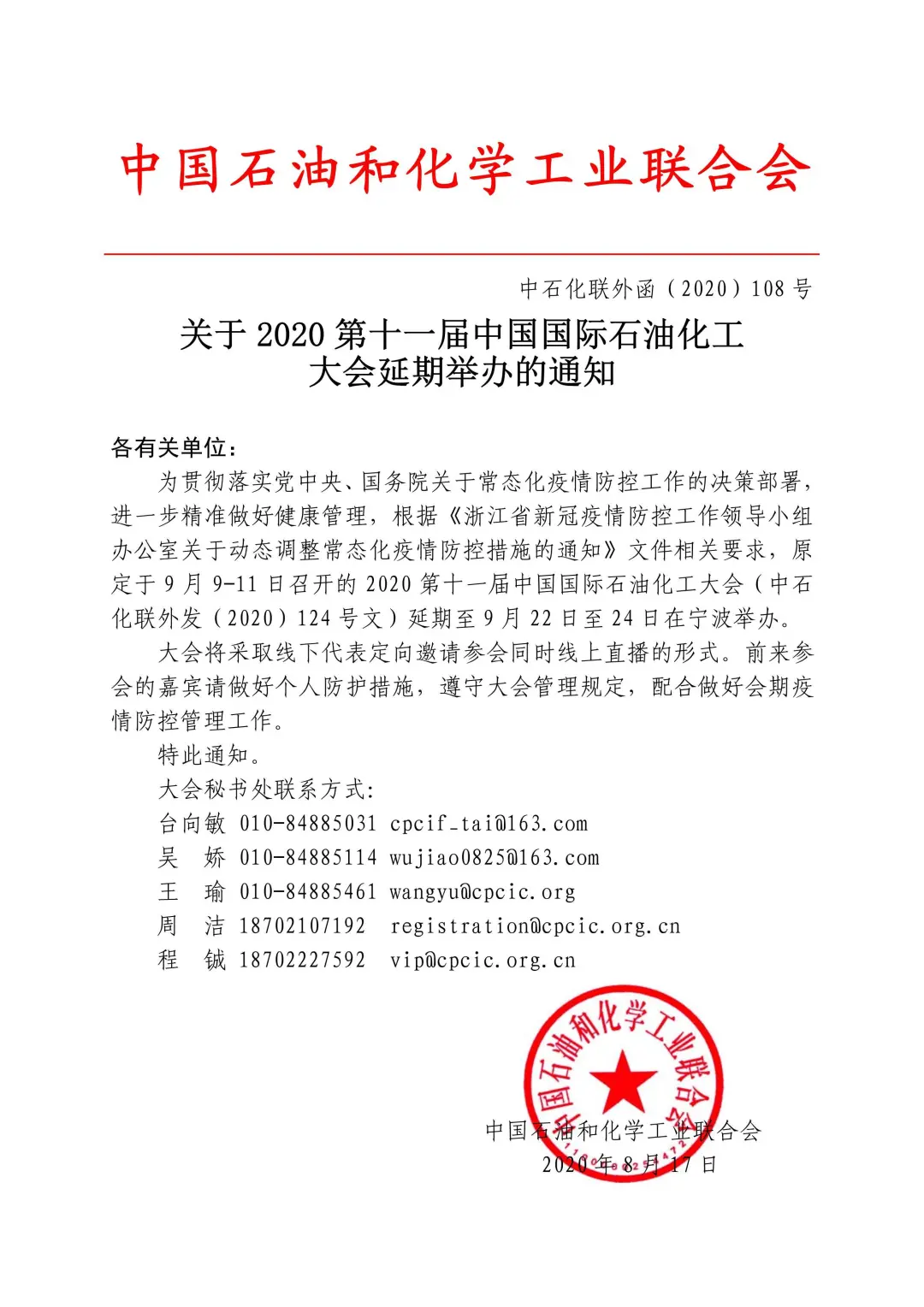 为贯彻落实党中央、国务院关于常态化疫情防控工作的决策部署,进一步精准做好健康管理,根据《浙江省新冠疫情防控工作领导小组办公室关于动态调整常态化疫情防 控措施的通知》文件相关要求,原定于9月9-11日召开的 2020 第十一届中国国际石油化工大会(中石化联外发(2020)124号文)延期至9月22日至24日在宁波举办。