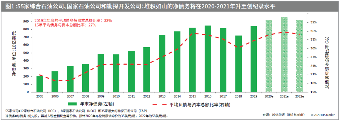 石油公司债务水平达到历史最高水平。全球55家上市国际石油公司、国家石油公司和勘探开发公司的净债务总额预计2021年底将达到9600亿美元的历史高点,与2019年年底相比增加约14%(见图1)。未来几年里,偿还这笔债务将耗费大量现金流。此外,总债务与总资本比率预计将从2019年底的33%升至2021年底的36%。这比2014年年底30%的价格跌幅还要高。未来几个季度可能会有更多资产减记,从而进一步推高负债率。